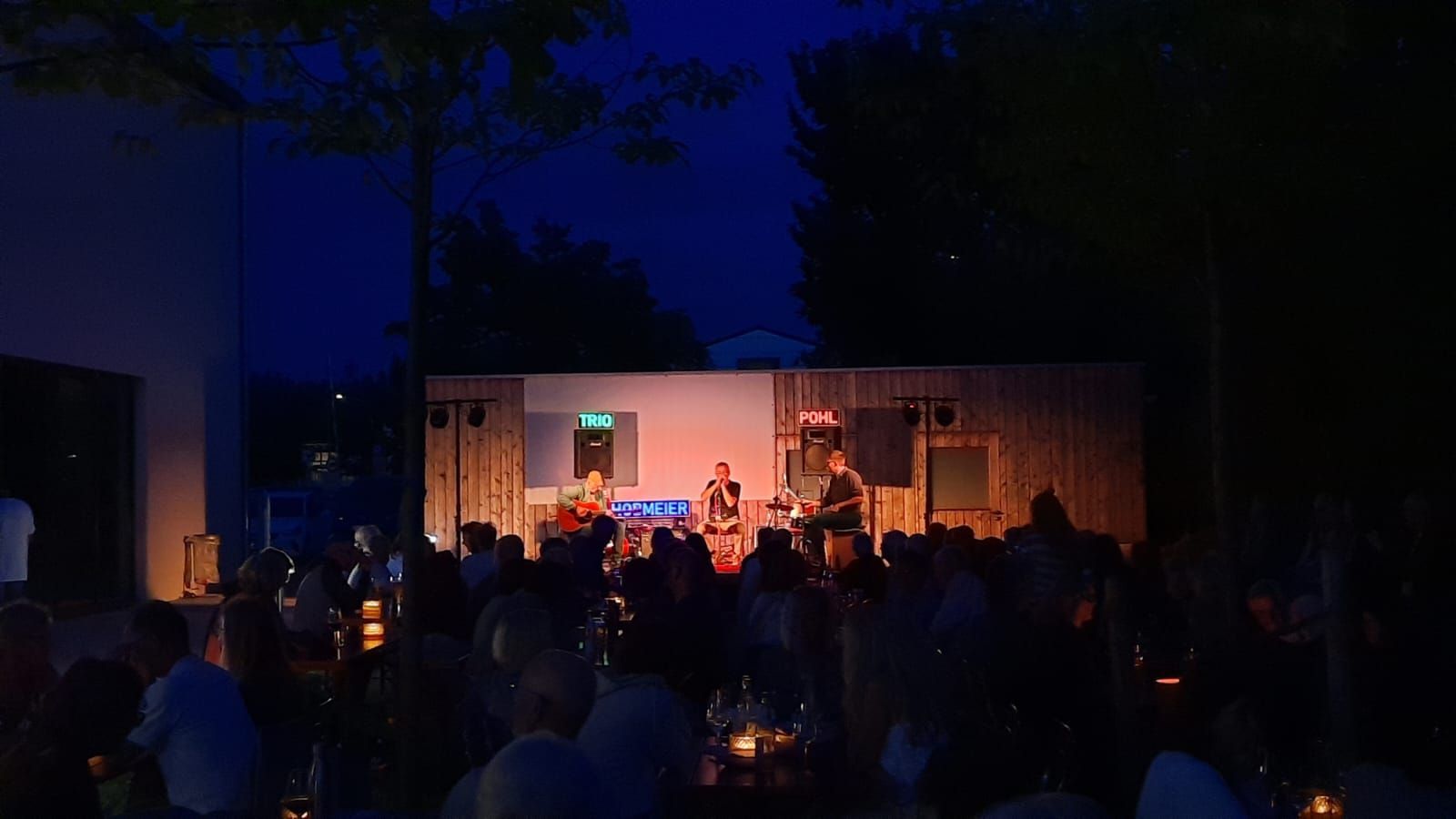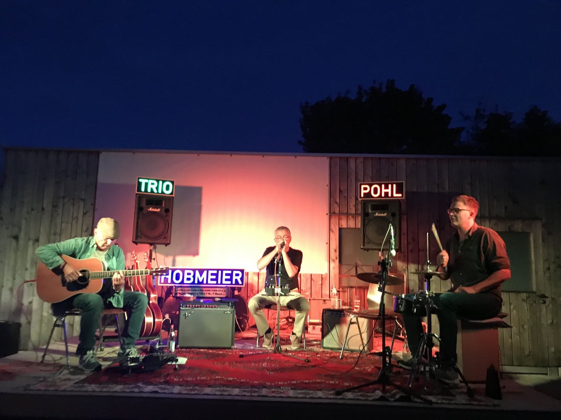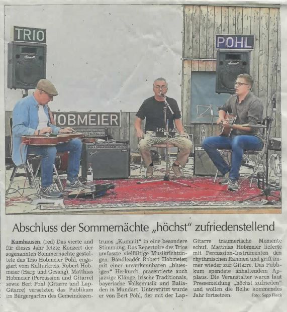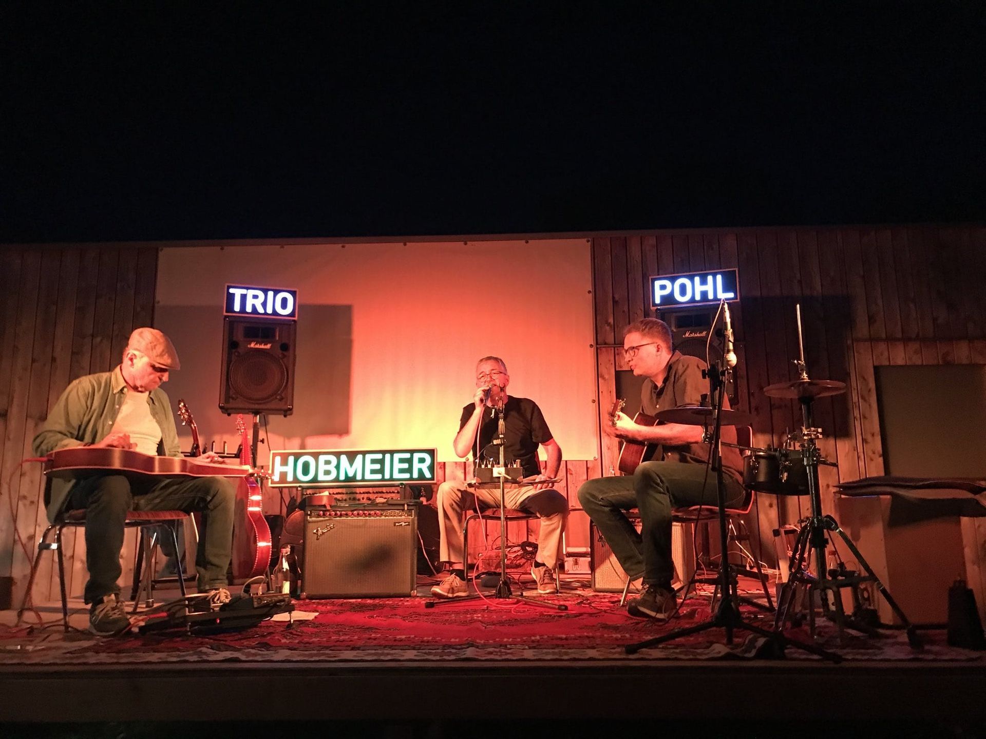 Generations- und genreübergreifend beschreibt das "Trio Hobmeier Pohl" wohl am besten. Seit 2019 treffen sich Robert Hobmeier (Harp & Gesang), Bert Pohl (Gitarre & Lap-Gitarre) und Matthias Hobmeier (Percussion-Schlagzeug & Gitarre) regelmäßig zum Proben. Geeint durch die Lust am gemeinsamen Musizieren und Experimentieren entstand eine Akkustikkombo aus Gitarre, wahlweise auch Lap-Gitarre, Percussion-Schlagzeug und Harp. Neben Instrumentalnummern gibt es auch Lieder mit Texten gesungen in Mundart. Nach den ersten Auftritten war klar: die Musik ist zu schön, um nur im stillen Kämmerlein geprobt zu werden.